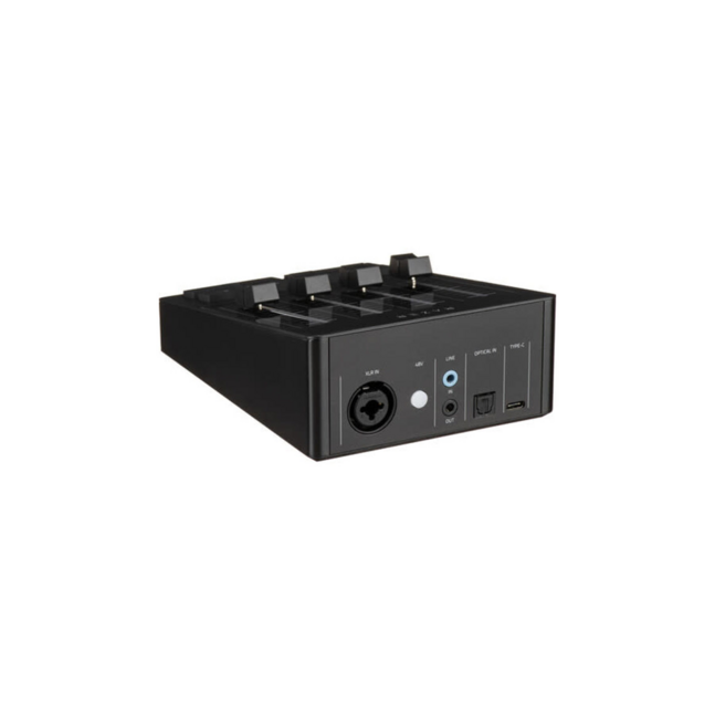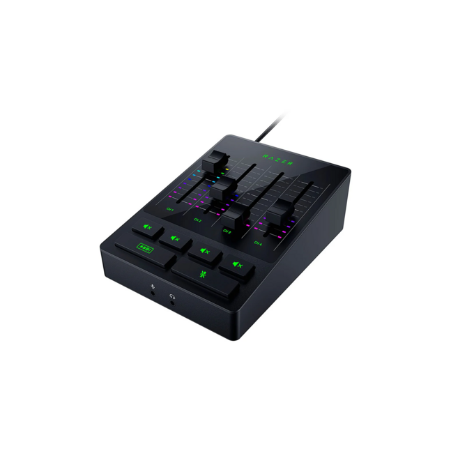 4 x Channel Volume Slide Faders, 4 x Channel Mute Buttons, 1 x Microphone Mute Button, 1 x Bleep Button, 1 x 48V Phantom Power Button